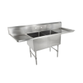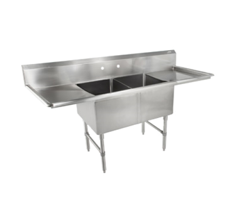 "B" Series Sink, 2-compartment, 71-1/2"W x 25-1/2"D x 44-1/16"H overall size, (2) 16"W x 20" front-to-back x 14" deep compartments, (2) 18" left & right drainboards, 10"H boxed backsplash with 45° top and 2" return, (1) set of splash mount faucet holes with 8" centers, 3-1/2" die-stamped drain openings, 16/300 stainless steel construction, stainless steel legs, adjustable side bracing, adjustable bullet feet, NSF, CSA-Sanitation