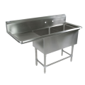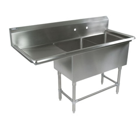 Pro-Bowl Sink, 2-compartment, 58-3/16"W x 23-1/2"D x 44-1/16"H overall size, (2) 18"W x 18" front-to-back x 14" deep compartments, (1) 18" left drainboard, 10"H boxed backsplash with 45° top & 2" return, (1) set of splash mount faucet holes with 8" centers, 3-1/2" die-stamped drain openings, 16/300 stainless steel construction, stainless steel legs, adjustable front & side bracing, adjustable bullet feet, NSF, CSA-Sanitation, KD
