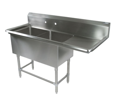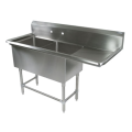 Pro-Bowl Sink, 2-compartment, 70-3/16"W x 23-1/2"D x 44-1/16"H overall size, (2) 18"W x 18" front-to-back x 14" deep compartments, (1) 30" right drainboard, 10"H boxed backsplash with 45° top & 2" return, (1) set of splash mount faucet holes with 8" centers, 3-1/2" die-stamped drain openings, 16/300 stainless steel construction, stainless steel legs, adjustable front & side bracing, adjustable bullet feet, NSF, CSA-Sanitation, KD