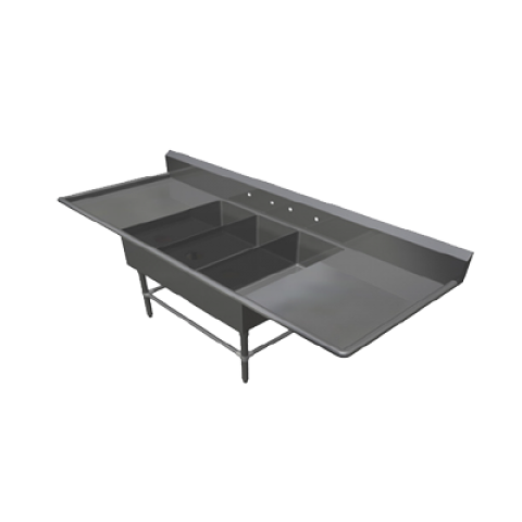 Pro-Bowl Platter Sink, 3-compartment, 105-1/4"W x 36-1/2"D x 43"H overall size, (3) 14"W x 31" front-to-back x 12" deep compartments, (2) 30" left & right drainboards, 10"H boxed backsplash with 45° top and 2" return, (1) set of splash mount faucet holes with 8" centers, 3-1/2" die-stamped drain openings, 16/300 stainless steel construction, stainless steel legs, adjustable front & side bracing, adjustable bullet feet, NSF, CSA-Sanitation, KD