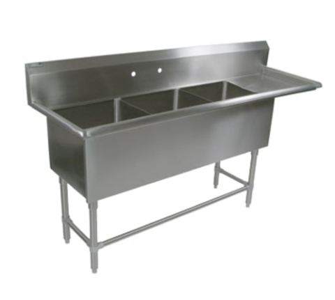 Pro-Bowl Sink, 3-compartment, 70-3/16"W x 25-1/2"D x 44-1/16"H overall size, (3) 16"W x 20" front-to-back x 14" deep compartments, (1) 18" right drainboard, 10"H boxed backsplash with 45° top & 2" return, (1) set of splash mount faucet holes with 8" centers, 3-1/2" die-stamped drain opening, 16/300 stainless steel construction, stainless steel legs, adjustable front & side bracing, adjustable bullet feet, NSF, CSA-Sanitation, KD