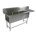 Pro-Bowl Sink, 3-compartment, 106-3/16"W x 29-1/2"D x 44-1/16"H overall size, (3) 24"W x 24" front-to-back x 14" deep compartments, (1) 30" right drainboard, 10"H boxed backsplash with 45° top & 2" return, (2) sets of splash mount faucet holes with 8" centers, 3-1/2" die-stamped drain opening, 16/300 stainless steel construction, stainless steel legs, adjustable front & side bracing, adjustable bullet feet, NSF, CSA-Sanitation, KD