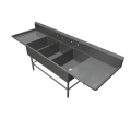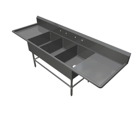 Pro-Bowl Sink, 3-compartment, 135-1/4"W x 29-1/2"D x 44-1/16"H overall size, (3) 24"W x 24" front-to-back x 14" deep compartments, (2) 30" left & right drainboards, 10"H boxed backsplash with 45° top and 2" return, (2) sets of splash mount faucet holes with 8" centers, 3-1/2" die-stamped drain opening, 16/300 stainless steel construction, stainless steel legs, adjustable front & side bracing, adjustable bullet feet, NSF, CSA-Sanitation, KD