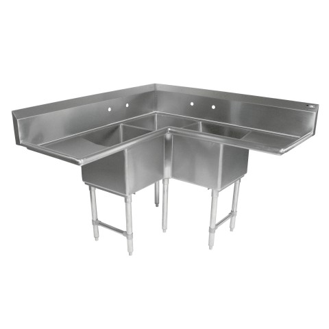Pro-Bowl Corner Sink, 3-compartment, 82-1/2"W x 82-1/2"D x 44-1/16"H overall size, (3) 24"W x 24" front-to-back x 14 deep compartments, (2) 30" left & right drainboards, 10"H boxed backsplash with 45° top and 2" return, (2) sets of splash mount faucet holes with 8" centers, 3-1/2" die-stamped drain opening, 16/300 stainless steel construction, stainless steel legs, bracing, & adjustable bullet feet, NSF, CSA-Sanitation
