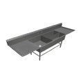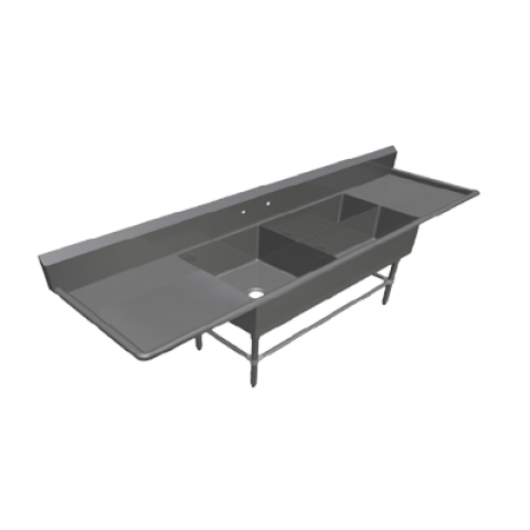 Pro-Bowl Platter Sink, 3-compartment, 119-3/16"W x 29-1/2"D x 43"H overall size, (1) 24"W x 24" front-to-back x 14" deep compartment, (2) 32"W x 12" front-to-back x 14" deep compartments, (2) 30" left & right drainboards, 10"H boxed backsplash with 45° top & 2" return, (1) set of splash mount faucet holes with 8" centers, 3-1/2" die-stamped openings, 16/300 stainless steel construction, stainless steel legs, adjustable front & side bracing, adjustable bullet feet, NSF, CSA-Sanitation, KD
