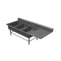 Pro-Bowl Sink, 3-compartment, 84-3/16"W x 33-1/2"D x 44-1/16"H overall size, (3) 20"W x 28" front-to-back x 12" deep compartments, (1) 20" right drainboard, 10"H boxed backsplash with 45° top & 2" return, (1) set of splash mount faucet holes with 8" centers, 3-1/2" die-stamped drain opening, 14/300 stainless steel construction, stainless steel legs, adjustable front & side bracing, adjustable bullet feet, NSF, CSA-Sanitation, KD