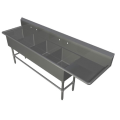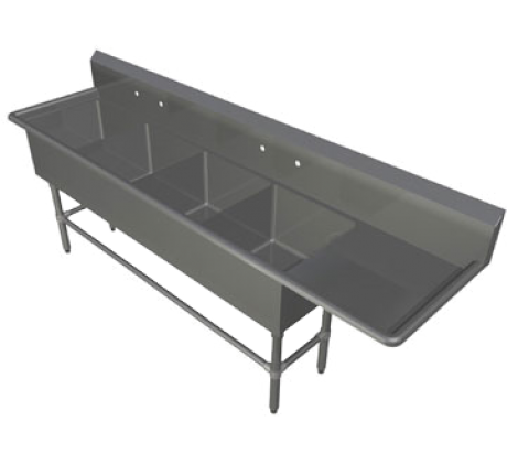 Pro-Bowl Sink, 4-compartment, 106-3/16"W x 29-1/2"D x 44-1/16"H overall size, (4) 18"W x 24" front-to-back x 14" deep compartments, (1) 30" right drainboard, 10"H boxed backsplash with 45° top & 2" return, (2) sets of splash mount faucet holes with 8" centers, 3-1/2" die-stamped drain openings, 14/300 stainless steel construction, stainless steel legs, adjustable front & side bracing, adjustable bullet feet, NSF, CSA-Sanitation, KD
