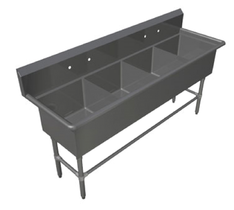 Pro-Bowl Sink, 4-compartment, 125-1/8"W x 29-1/2"D x 44-1/16"H overall size, (4) 30"W x 24" front-to-back x 12" deep compartments, 10"H boxed backsplash with 45° top & 2" return, (2) sets of splash mount faucet holes with 8" centers, 3-1/2" die-stamped drain openings, 14/300 stainless steel construction, stainless steel legs, adjustable front & side bracing, adjustable bullet feet, NSF, CSA-Sanitation, KD