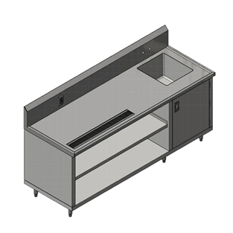 Beverage Table, cabinet base with open front, 132"W x 30"D x 45-3/4"H overall size, 14/300 stainless steel top with 10" backsplash, marine edge top, Stallion Safety Edge front and square turndown ends, (1) 18"W x 18" front-to-back x 12" deep sink on right, (1) set of splash mount faucet holes with 4" centers, 3-1/2" drain opening, hinged door in front of sink, 36" urn trough & louvered grate with 2" drain, (1) intermediate shelf, includes 1-ph duplex outlet in backsplash, 18/430 stainless steel wrap with legs & adjustable feet, NSF