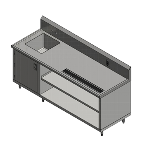 Beverage Table, cabinet base with open front, 96"W x 30"D x 45-3/4"H overall size, 14/300 stainless steel top with 10" backsplash, marine edge top, Stallion Safety Edge front and square turndown ends, (1) 18"W x 18" front-to-back x 12" deep sink on left, (1) set of splash mount faucet holes with 4" centers, 3-1/2" drain opening, hinged door in front of sink, 36" urn trough & louvered grate with 2" drain, (1) intermediate shelf, includes 1-ph duplex outlet in backsplash, 18/430 stainless steel wrap with legs & adjustable feet, NSF