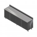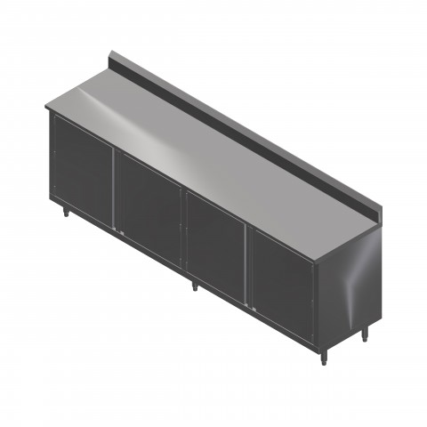 Work Table, cabinet base with (3) sets of hinged doors, 144"W x 30"D, 14/300 stainless steel top with 5" backsplash, Stallion Safety Edge front, (1) midshelf, 18/430 stainless steel wrap, stainless steel legs with adjustable feet, NSF