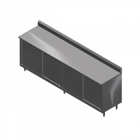 Work Table, cabinet base with sliding doors, 132"W x 24"D, 14/300 stainless steel top with 5" backsplash, Stallion Safety Edge front, 18/430 stainless steel body, stainless steel legs with adjustable feet, NSF