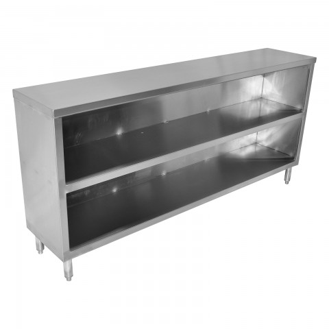 Dish Cabinet, open front, 84"W x 18"D x 35"H, 14/300 stainless steel top, 18/430 stainless steel body, open base with stainless steel mid-shelf, stainless steel legs & adjustable bullet feet