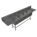 Pro-Bowl Sink, 4-compartment, 123-1/4"W x 23-1/2"D x 44-1/16"H overall size, (4) 18"W x 18" front-to-back x 14" deep compartments, (2) 24" left & right drainboards, 10"H boxed backsplash with 45° top & 2" return, (2) sets of splash mount faucet holes with 8" centers, 3-1/2" die-stamped drain openings, 16/300 stainless steel construction, stainless steel legs, adjustable front & side bracing, adjustable bullet feet, NSF, CSA-Sanitation, KD
