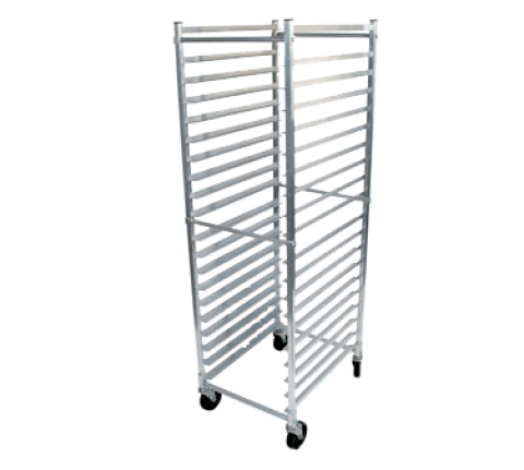 Bun Pan Rack, mobile, (20) pan capacity, 3" spacing, front loading, 26"W x 20-1/2"D x 69"H, 1" square tube frame with bolted cross bracing, 5" swivel casters, 6063 aluminum construction, KD, NSF (Available in Effingham and Nevada)