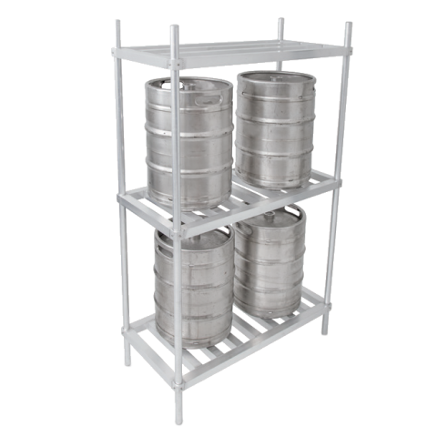 Keg Rack, 60"W x 20"D x 76"H, (3) shelves, accommodates (6) kegs, mid & bottom shelves are constructed of 1-3/4" square tubing running front-to-back with a load rating of 60 lb/ft², top shelf is constructed of 1-3/4" square tubing running left-to-right with a load rating of 15 lb/ft², 1-5/16" dia. post, aluminum construction (Available in Effingham and Nevada)