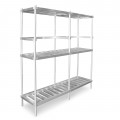 Keg Rack, 80"W x 20"D x 76"H, (3) shelves, accommodates (8) kegs loose, mid & bottom shelves are constructed of 1-3/4" square tubing running front-to-back with a load rating of 60 lb/ft², top shelf is constructed of 1-3/4" square tubing running left-to-right with a load rating of 15 lb/ft², 1-5/16" dia. post, aluminum construction
