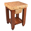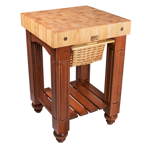 American Heritage Gathering Block I, 25"W x 24"D x 36"H overall size, 4" thick end grain top, Northern Hard Rock Maple, with Oil Finish, (1) wicker basket accessible from either side, painted wood base with slatted undershelf, distressed finish