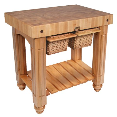 American Heritage Gathering Block II, 36"W x 24"D x 36"H overall size, 4" thick end grain top, Northern Hard Rock Maple, with Oil Finish, (2) wicker baskets accessible from either side, painted wood base with slatted undershelf, distressed finish