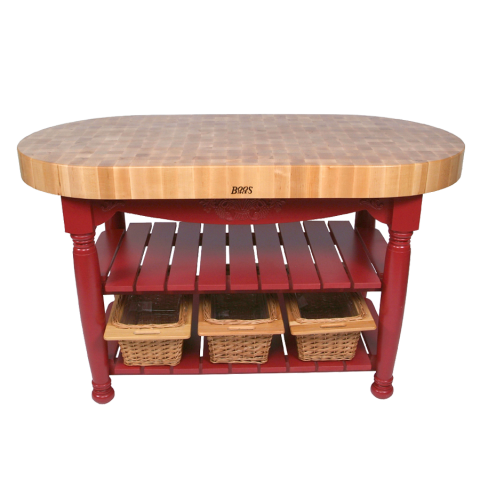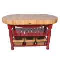 Harvest Table, oval, 60"W x 30"D x 36"H overall size, 4" thick end grain top, Northern Hard Rock Maple, with Oil Finish, (3) wicker baskets, painted base with (2) slatted undershelves