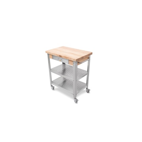 Cucina Elegante Cart, 30"W x 20"D x 35"H overall size, 1-1/2" thick edge grain top, Northern Hard Rock Maple, with Varnique finish, without leaves, (1) stainless steel front dovetailed drawer, (2) stainless steel shelves, stainless steel towel bar, stainless steel legs, 3" locking casters, KD