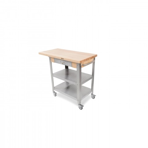 Cucina Elegante Cart, 40"W x 20"D x 35"H overall size, 1-1/2" thick edge grain top, Northern Hard Rock Maple, with Varnique finish, (1) 10" drop leaf, (1) stainless steel front dovetailed drawer, (2) stainless steel shelves, stainless steel towel bar, stainless steel legs, 3" locking casters, KD