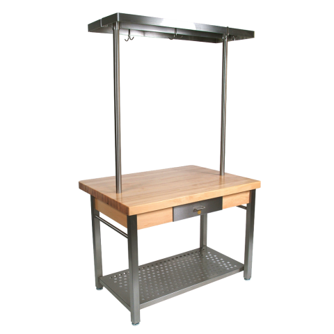 Cucina Grande' Work Table, 60"W x 36"D x 35"H overall size, 2-1/4" thick edge grain flat top, Northern Hard Rock Maple with Varnique finish, perforated 18/300 stainless steel undershelf, (1)stainless steel front dovetailed drawer, (2) stainless steel towel bars, (1) 8" drop leaf rear mounted, adjustable feet, KD