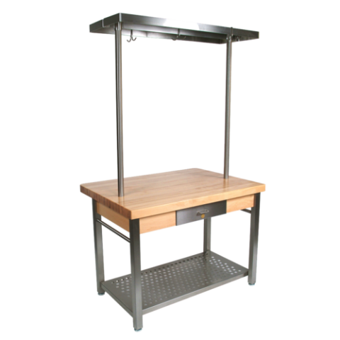 Cucina Grande' Work Table, 48"W x 28"D x 35"H overall size, 2-1/4" thick edge grain flat top, Northern Hard Rock Maple with Varnique finish, perforated 18/300 stainless steel undershelf, (1)stainless steel front dovetailed drawer, (2) stainless steel towel bars, includes pot rack, 5" locking casters, KD