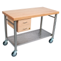 Cucina Magnifico Work Table, 48"W x 24"D x 35"H overall size, 2-1/4" thick edge grain top, Northern Hard Rock Maple, with Varnique finish, stainless steel undershelf, double dovetailed drawer unit left side, stainless steel towel bar, electric outlet strip, 5" locking casters