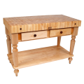 Cucina Rustica Butcher Block, 48"W x 24"D x 34-1/2"H overall size, 4" thick end grain top, Northern Hard Rock Maple, with Oil Finish, Northern Hard Rock Maple legs, (2) dovetailed drawers, solid wood shelf, adjustable leveling feet, KD