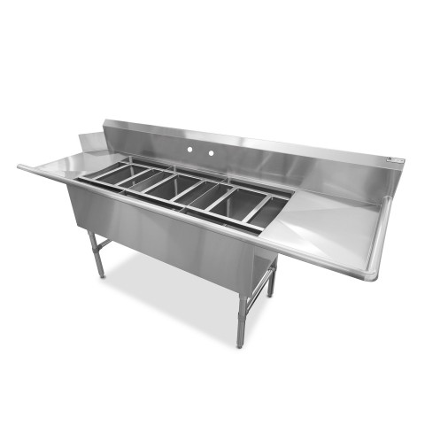 Dishtable/Pot Sinks, clean, straight design, 91-5/8"W x 30-3/8"D x 44-1/16"H overall size, (3) 18"W x 24" front-to-back x 14" deep compartments, (2) 18" drainboards, dish machine attachment on left side, 10"H boxed backsplash, (1) set of splash mount faucet holes with 8" centers, (3) rack slides with storage bracket, 16/300 stainless steel construction, stainless steel legs, bracing, & adjustable bullet feet, NSF, CSA-Sanitation