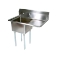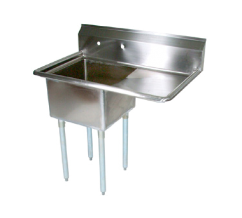 E-Series Sink, 1-compartment, 36-1/2"W x 25-1/2"D x 43-3/4"H overall size, (1) 16"W x 20" front-to-back x 12" deep compartment, (1) 18" right drainboard, 9-3/4"H boxed backsplash with 45° top and 2" return, (1) set of splash mount faucet holes with 8" centers, 3-1/2" die-stamped drain openings, 18/300 stainless steel, galvanized legs & gussets, adjustable plastic bullet feet, NSF, CSA-Sanitation