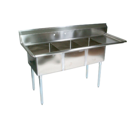 E-Series Sink, 3-compartment, 47-1/2"W x 19-1/2"D x 43-3/4"H overall size, (3) 10"W x 14" front-to-back x 10" deep compartments, 15" drainboard on right, 9-3/4"H boxed backsplash with 45° top and 2" return, (1) set of splash mount faucet holes with 8" centers, 3-1/2" diameter die-stamped drain openings, 18/300 stainless steel, galvanized legs & gussets, adjustable plastic bullet feet, NSF,