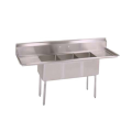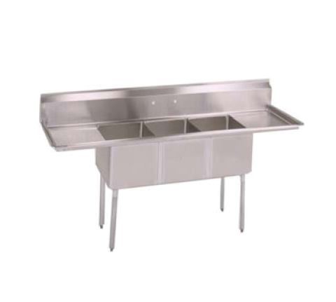 E-Series Sink, 3-compartment, 90"W x 23-1/2"D x 43-3/4"H overall size, (3) 18"W x 18" front-to-back x 14" deep compartments, (2) 18" left & right drainboards, 9-3/4"H boxed backsplash with 45° top and 2" return, (1) set of splash mount faucet holes with 8" centers, 3-1/2" diameter die-stamped drain openings, 18/300 stainless steel, galvanized legs & gussets, adjustable plastic bullet feet, NSF, CSA-Sanitation (Available in Effingham)