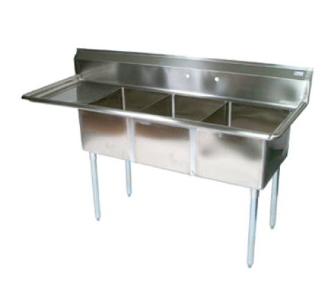 E-Series Sink, 3-compartment, 98-1/2"W x 29-1/2"D x 43-3/4"H overall size, (3) 24"W x 24" front-to-back x 14" deep compartments, (1) 24" left drainboard, 9-3/4"H boxed backsplash with 45° top and 2" return, (2) sets of splash mount faucet holes with 8" centers, 3-1/2" diameter die-stamped drain openings, 18/300 stainless steel, galvanized legs & gussets, adjustable plastic bullet feet, NSF, CSA-Sanitation