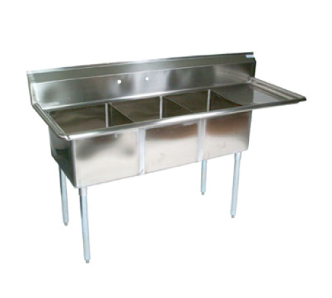 E-Series Sink, 3-compartment, 98-1/2"W x 29-1/2"D x 43-3/4"H overall size, (3) 24"W x 24" front-to-back x 14" deep compartments, (1) 24" right drainboard, 9-3/4"H boxed backsplash with 45° top and 2" return, (2) sets of splash mount faucet holes with 8" centers, 3-1/2" diameter die-stamped drain openings, 18/300 stainless steel, galvanized legs & gussets, adjustable plastic bullet feet, NSF, CSA-Sanitation (Available in Effingham)