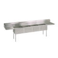 E-Series Sink, 4-compartment, 100"W x 25-1/2"D x 43-3/4"H overall size, (4) 16"W x 20" front-to-back x 14" deep compartments, (2) 18" drainboards, 9-3/4"H boxed backsplash with 45° top and 2" return, (2) sets of splash mount faucet holes with 8" centers, 3-1/2" die-stamped drain openings, 18/300 stainless steel, galvanized legs & gussets, adjustable plastic bullet feet, NSF, CSA-Sanitation (Available in Effingham)