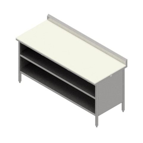 Work Table, cabinet base with open front, 60"W x 30"D, 3/4" reversible poly surface, 5" backsplash, Stallion Safety Edge on front, 16/300 stainless steel top, stainless steel construction, undershelf, & 1" adjustable bullet feet, all welded set-up, NSF