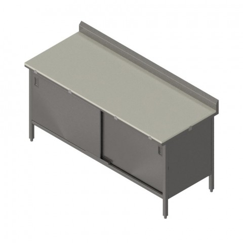 Work Table, cabinet base with sliding doors, 108"W x 30"D, 16/300 stainless steel top with 5" backsplash and 3/4" reversible poly surface, Stallion Safety Edge on front, 90° turndown on sides, stainless steel base, undershelf, & 1" adjustable bullet feet, all welded set-up, NSF