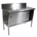 Work Table, cabinet base with sliding doors, 108"W x 30"D, 14/300 stainless steel top with 5" backsplash, Stallion Safety Edge front, 90° turndown on sides, stainless steel base, undershelf, & 1" adjustable bullet feet, all welded set-up, NSF