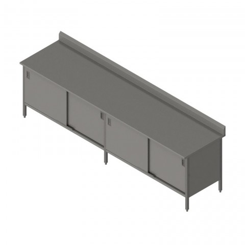 Work Table, cabinet base with sliding doors, 132"W x 24"D, 16/300 stainless steel top with 5" backsplash, Stallion Safety Edge front, 90° turndown on sides, stainless steel base, undershelf, & 1" adjustable bullet feet, all welded set-up, NSF