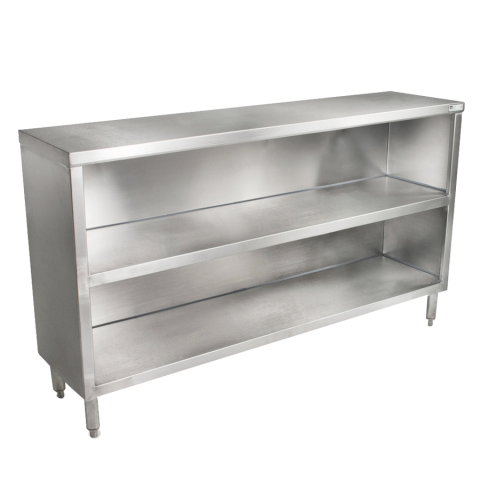 Dish Cabinet, open front, 60"W x 15"D x 35"H overall size, open base with mid-shelf, Stallion Safety Edge front, 18/300 stainless steel construction, stainless steel legs with adjustable bullet feet, NSF