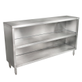 Dish Cabinet, open front, 72"W x 15"D x 35"H overall size, open base with mid-shelf, Stallion Safety Edge front, 18/300 stainless steel construction, stainless steel legs with adjustable bullet feet, NSF