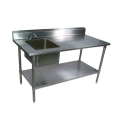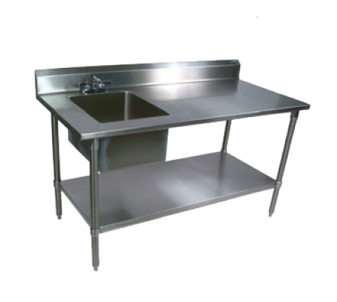 Work Table With Prep Sink, 72"W x 30"D x 40-3/4"H overall size, (1) 16"W x 20" front-to-back x 10" deep sink bowl on left, 5"H backsplash, (1) set of deck mount faucet holes 4" O.C. (faucet not included), 18/300 stainless steel, stainless steel legs & adjustable undershelf, 1" stainless steel adjustable bullet feet, KD, NSF, CSA-Sanitation (available in Effingham and Nevada)