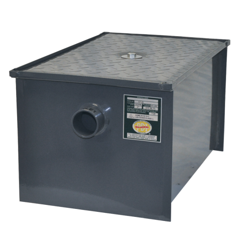 Grease Interceptor, 50 lb. grease capacity, 25 gallons per minute flow rate, 3" inlet/outlet, no-hub connections, T-Vent included, no-skid cover, removable baffle, easy removable cover, integral trap, vented inlet flow control device, 1/8" thick carbon steel, PDI certified