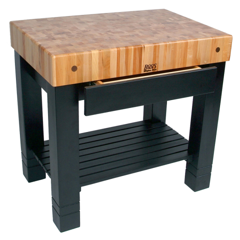 American Heritage Homestead Block, 36"W x 24"D x 34"H overall size, 5" thick end grain top, Northern Hard Rock Maple, with Oil Finish, slatted lower shelf, seamless utensil drawer, painted base