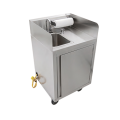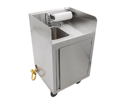 Mobile Hand Sink, self contained, 26"W x 24"D x 36"H, 2-1/2 gallon water heater, removable (5) gallon fresh water tank and (6) gallon waste water tank, 16/300 stainless steel top and panel, 8" rear riser and side splashes, 20 gauge door with magnetic catch, (1) 10"W x 14" front-to-back x 5" deep sink bowl, with free flow drain, gooseneck faucet, 5" locking casters, GFI outlet with 6 foot cord, 15 amp, 120V/60/1-ph