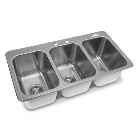 Pro-Bowl Drop-In Sink, 3-compartment, 36"W x 18-1/2"D x 10"H overall size, (3) 10"W x 14" front-to-back x 10"deep bowls, deck mount faucet holes with 4" centers, 3-1/2" drain opening with basket drain, stainless steel construction, (faucet not included), NSF, CSA-Sanitation