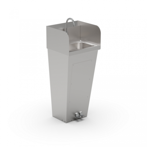 Pro-Bowl Hand Sink, floor mount, tappered pedestal, 14"W x 10" front-to-back x 5" deep bowl, 9-3/4"H backsplash with left and right side splashes, (1) centered splash mount faucet hole, 3-1/2" gooseneck spout, 2" drain opening with basket drain, double foot valves (PBF-FV2-SM-35GLF), 18/300 stainless steel construction, NSF