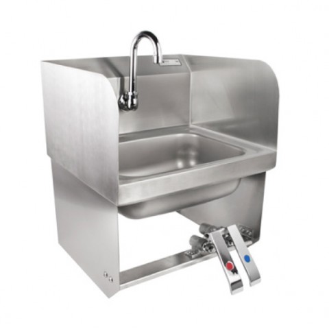 Pro-Bowl Hand Sink, wall mount, 14"W x 10" front-to-back x 5" deep bowl, (1) centered splash mount faucet hole, gooseneck spout, double knee valves, 2" drain opening, includes basket drains & wall brackets, with left & right side splashes, all stainless steel construction, NSF, (knee valve faucet included) (Available in Effingham and Nevada)